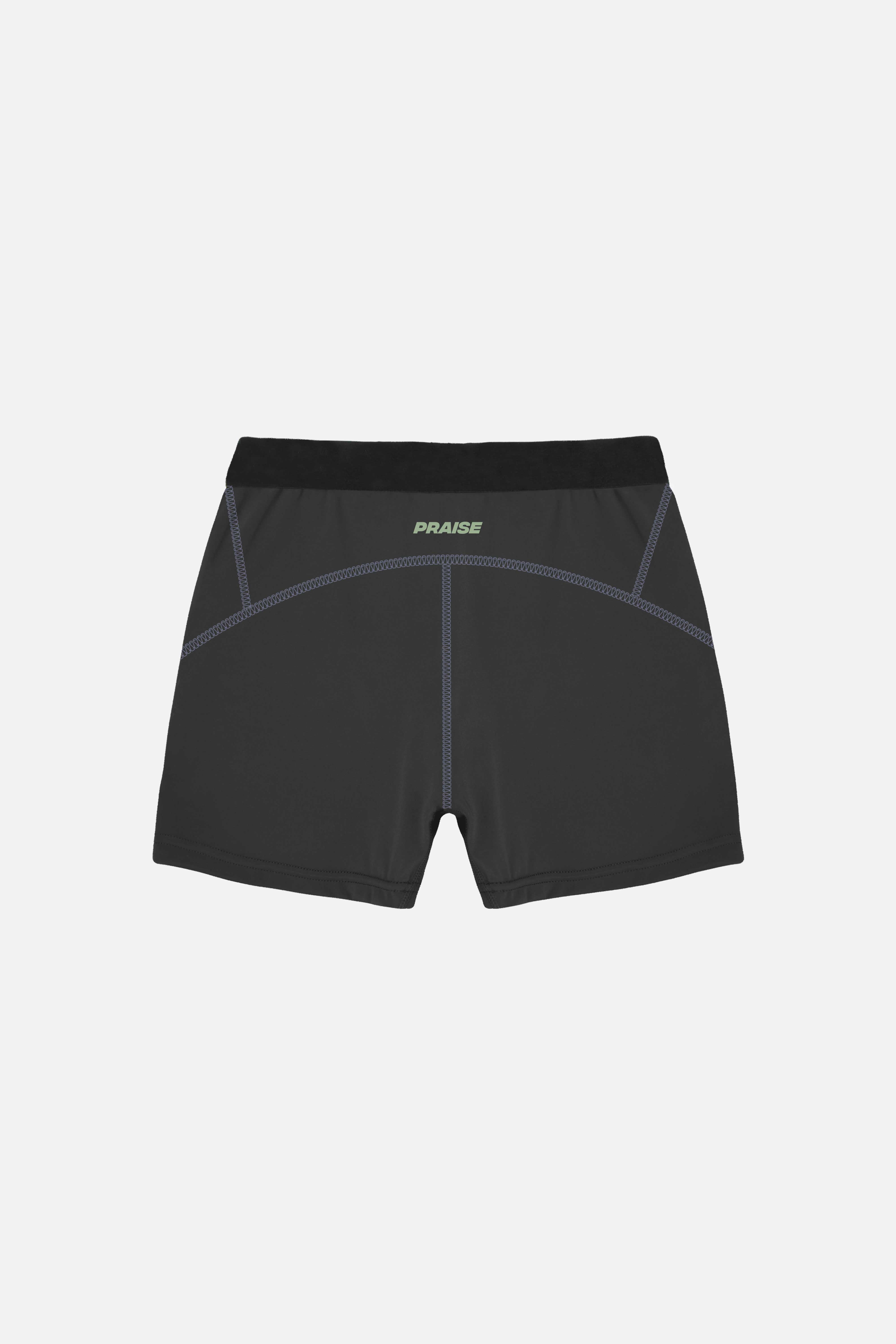 Technical short with side pockets. Quick dry. Inner back pocket for gel, card, and/or keys. Adjustable drawcords at waist. Reflective PRAISE logo print on the side.
