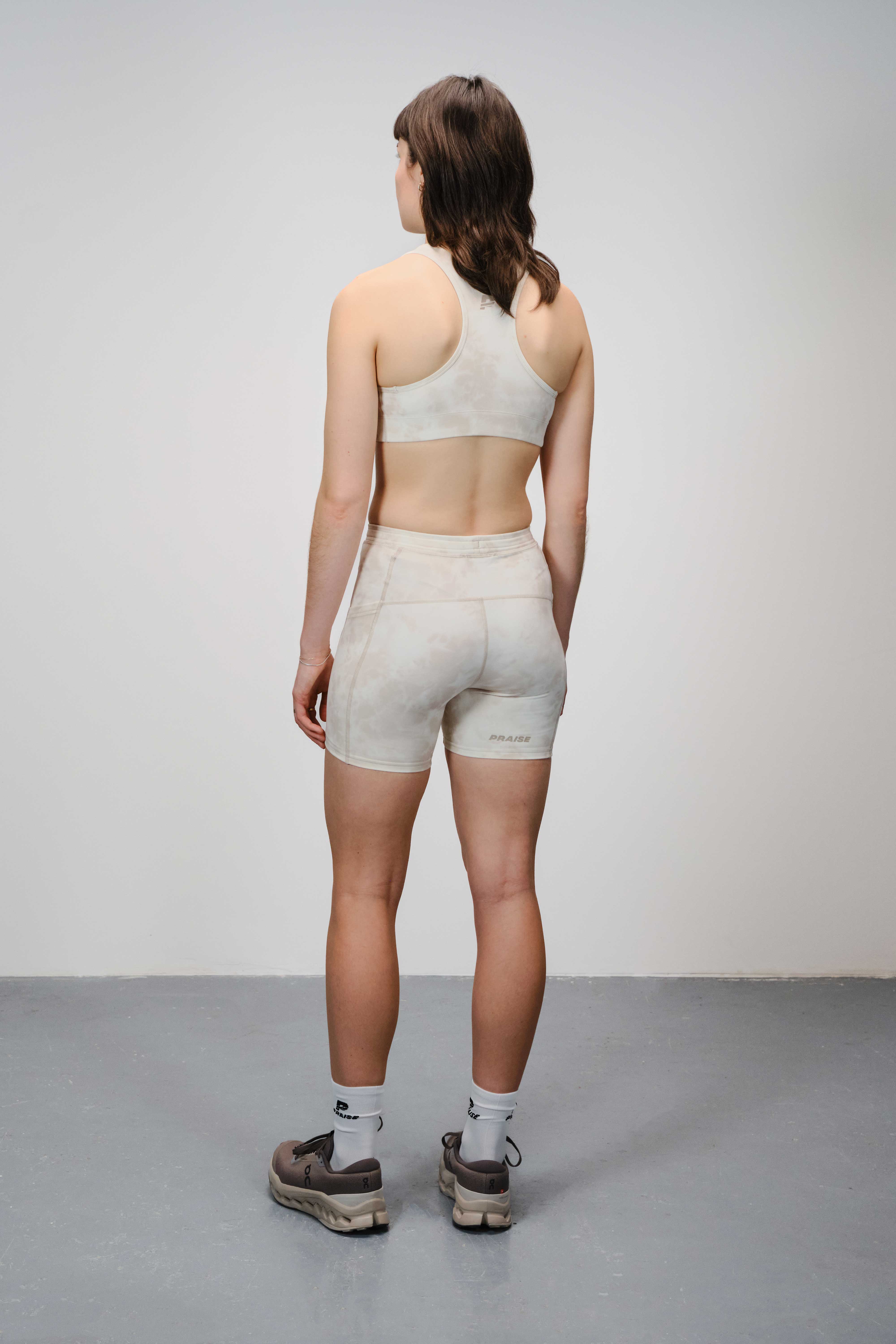 Technical short with side pockets. Quick dry. Inner back pocket for gel, card, and/or keys. Adjustable drawcords at waist. Reflective PRAISE logo print on the side.