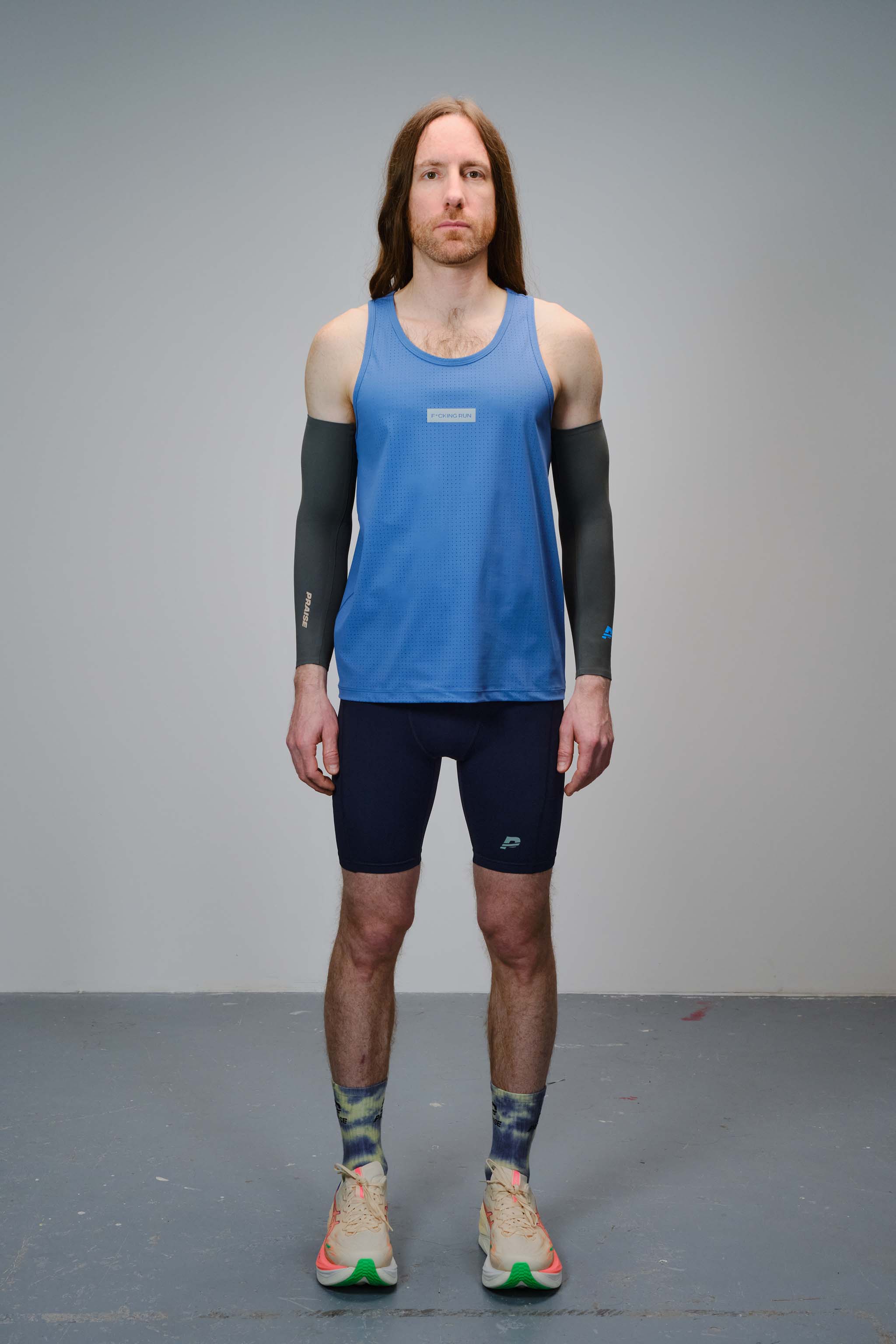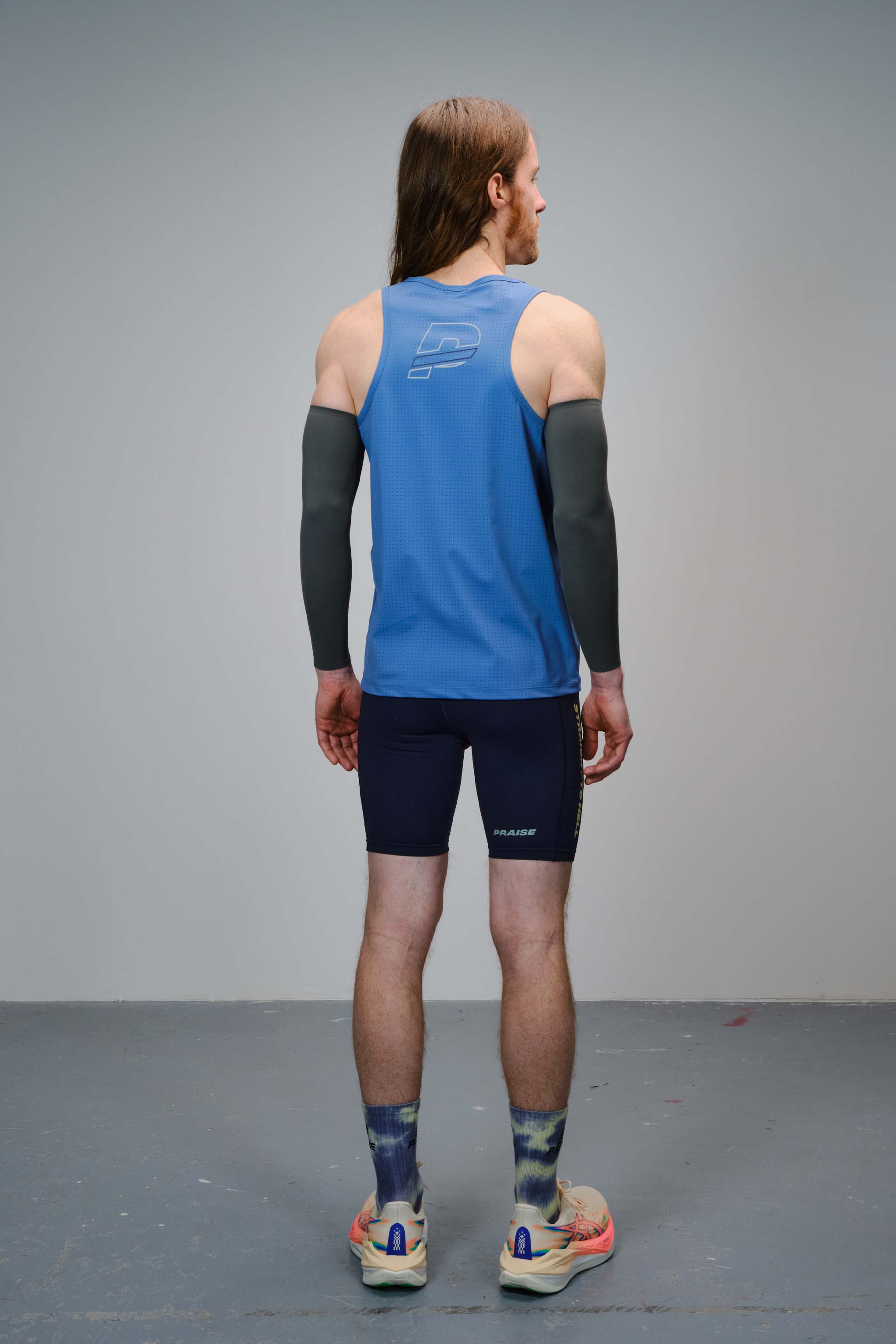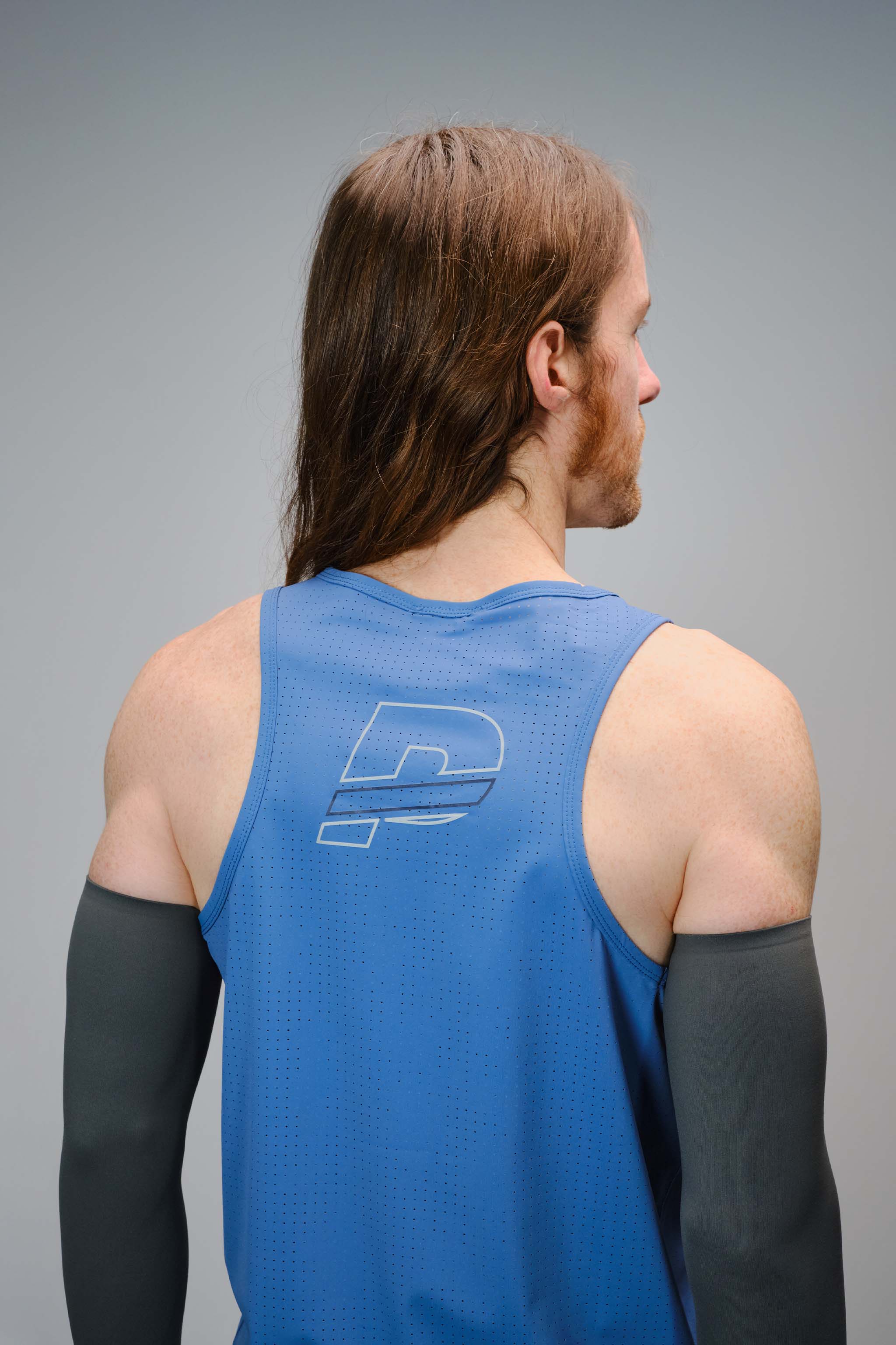 Lightweight running tank top made with breathable laser cut and stretch performance mesh. Reflective print at chest and reflective logo at back.