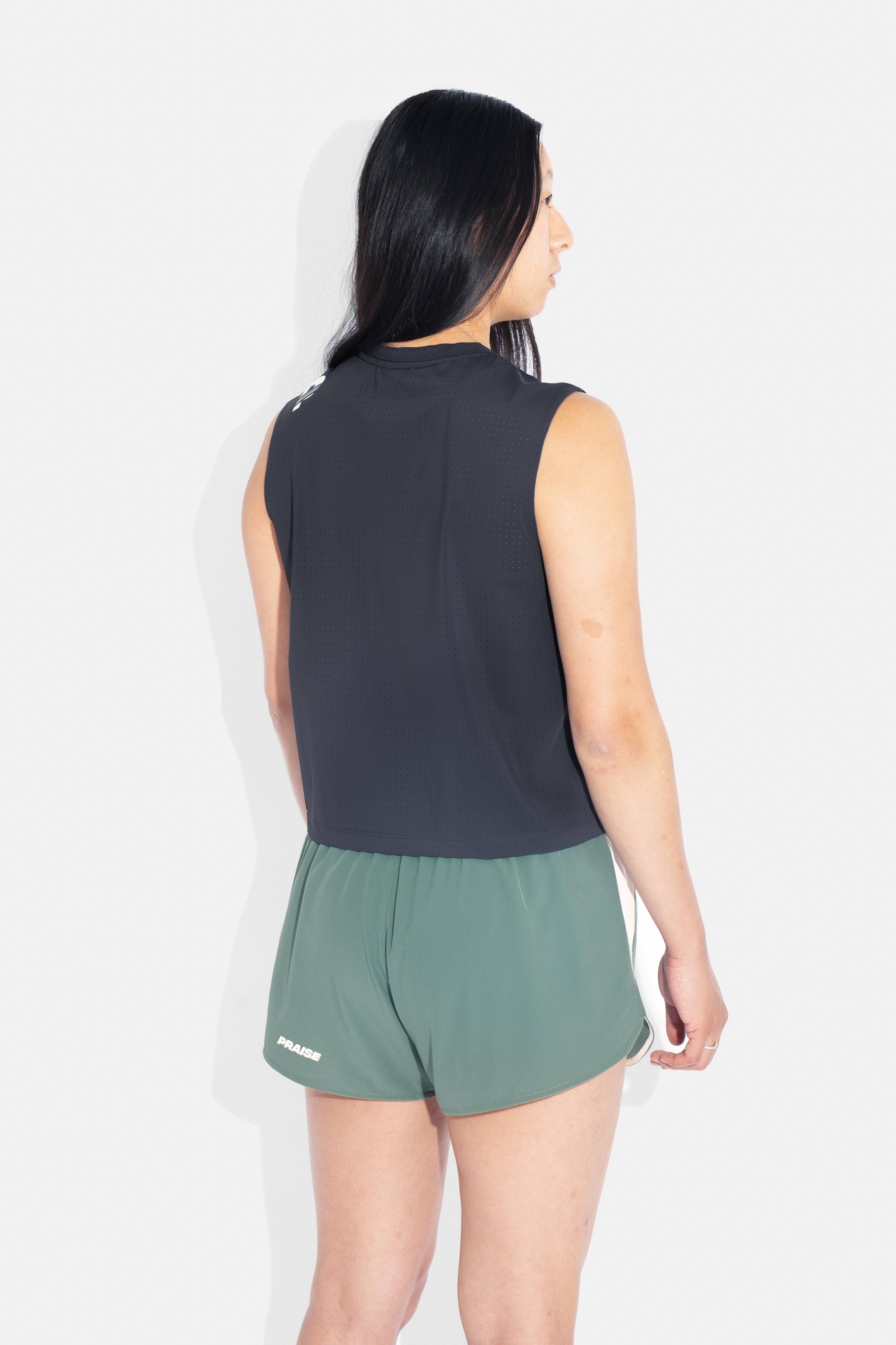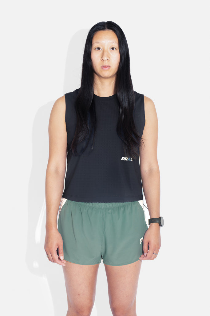 Lightweight running cut off top made from breathable, laser cut and stretch performance mesh. Reflective print at chest and reflective logo at back.